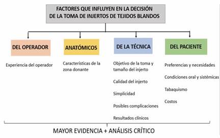 Conclusiones: Los factores que deben considerarse para la toma de injertos de tejidos blandos tienen que ver con el objetivo de la toma, características anatómicas, resultados clínicos, complicaciones postoperatorias, simplicidad de la toma, calidad del injerto, experiencia del operador, factores inherentes al paciente, nivel de evidencia y costos.