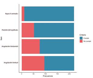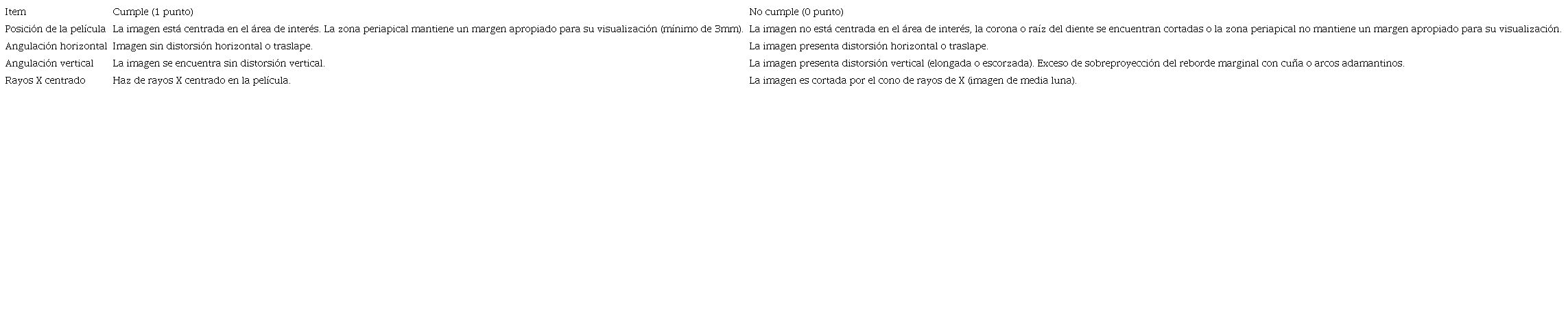 Se evaluó la calidad radiográfica mediante una pauta creada para esta investigación (Tabla 1), basada en cuatro parámetros de evaluación descritos en estudios previos con objetivos similares: posición de la película, angulación horizontal, angulación vertical y rayos X centrado, se le asignó una puntuación de 1 punto al criterio “cumple”, y de 0 punto al criterio “no cumple” para cada ítem. Se consideraron con calidad aceptable, aquellas radiografías con utilidad diagnóstica que obtuvieron puntuaciones de 4 puntos, y como calidad inaceptable, a las radiografías que obtuvieron puntuaciones entre 0 a 3 puntos. La categorización dicotómica aceptable e inaceptable, se debe a la necesidad de identificar un punto en el cual las radiografías deben ser repetidas por no cumplir con los criterios de calidad mínimos para ser consideradas diagnósticas.
