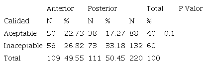 De las 220 radiografías evaluadas, 109 corresponden al sector anterior y 111 al posterior. Según los criterios de evaluación de calidad, un total de 88 (40%) radiografías fueron de calidad aceptable y 132 (60%) inaceptable. El promedio de puntaje considerando la totalidad de las radiografías evaluadas fue de 2.9 (±1.0).