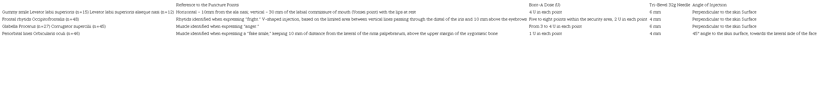 The BoNT-A used was Botox® 100U (Allergan do Brasil, Guarulhos, São Paulo, Brazil), reconstituted in 2 mL of saline solution at 0.9%2. The injection procedure followed the manufacturer’s instructions presented in the package insert. The injections were performed by a professional duly trained in these procedures. Facial regions, dosages, and injection techniques adopted were in agreement with the literature, as presented in Table 1.