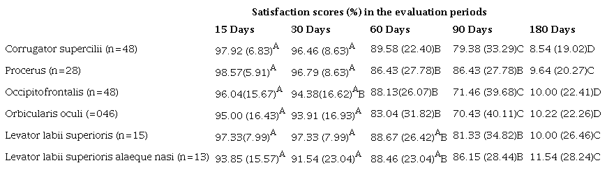According to the data analyses, significant differences occurred between patients’ satisfaction scores during the follow-up periods (p<0.0001), considering each facial region treated. From 15 to 30 days post-operation, patients provided very good percentages of treatment satisfaction for all facial regions, with values above 90%. However, the effect decreased significantly at 60 days for the treatments performed in the upper third of the Corrugator supercilii, Procerus, Orbicularis oculi, and Occipitofrontalis muscles, although satisfaction scores were still high. At that time, values of Occipitofrontalis, Levator labii superioris, and Levator labii superioris alaeque nasi muscles were similar to 60 days. In the period of 90 days, there was a significant decrease in the scores of Corrugator supercilii, Occipitofrontalis and Orbicularis oculi in relation to 60 days, but the values showed a good level of satisfaction. Moroever, at 90 days the scores for Procerus, Levator labii superioris, and Levator labii superioris alaeque nasi muscles remained similar to the scores at 60 days, also demonstrating good satisfaction of the participants. At 180 days, the scores decreased significantly in relation to other evaluation days, demonstrating low satisfaction in relation to the clinical effects of BoNT-A for all muscles. The satisfaction scores are described in table 2.