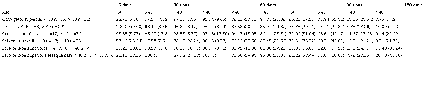 Our study suggests that treatment with BoNT-A for aesthetic facial treatments was effective for up to 90 days, depending on the treated muscle, and at 180 days all muscles differed significantly from other days, showing low satisfaction with the treatment. In the comparative analyzes between women under 40 and over 40 years of age, there was no significant difference. However, the muscles Corrugator supercilii and Occipitofrontalis, showed a negative correlation in women under 40 years. Reinforcing, the importance of the patient to follow up with the clinician so that he can observe the correct dose in order to avoid overdosing or unnecessary recurrent injection.
