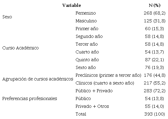 Participaron un total de 393 estudiantes de pregrado de la Escuela de Odontología de la Universidad de Talca, correspondiendo a una tasa de respuesta del 70,68%. Las características sociodemográficas de los participantes se presentan en la Tabla 1. Del total de estudiantes que respondieron al estudio mayoritariamente fueron mujeres, correspondiente a un 68,2% (N=268). Sólo 18 estudiantes (4.6%) reportaron ser pertenecientes a algún pueblo originario.