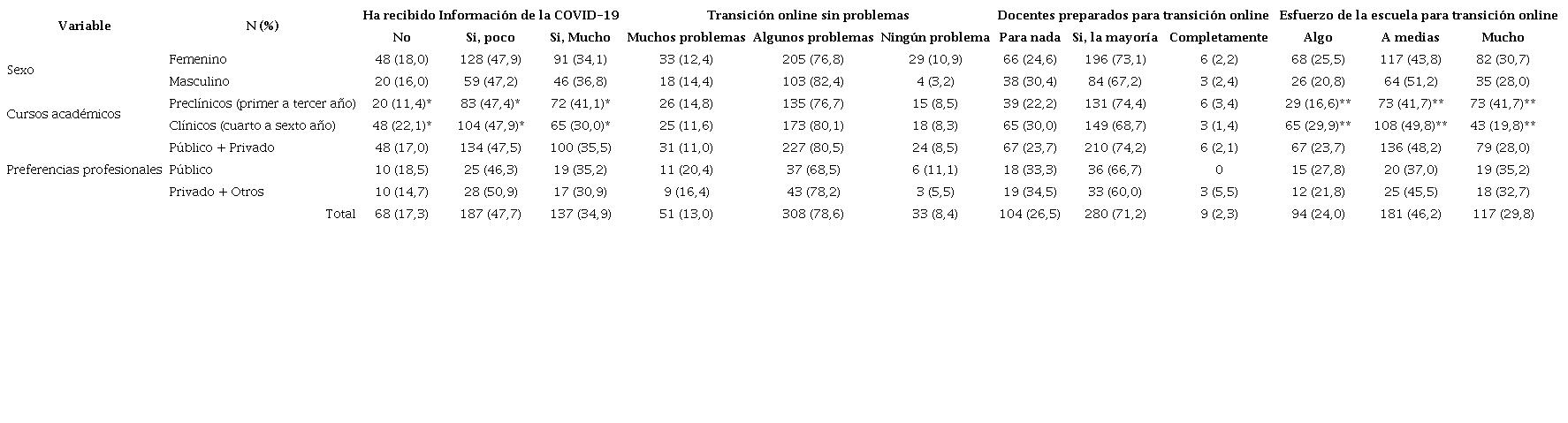 Percepción de los estudiantes sobre la pandemia y la transición hacia la docencia telemática: En la Tabla 2 se aprecia que un 47,7% (N=187) de los encuestados considera que han recibido poca información sobre la pandemia. En cuanto a la docencia virtual, un 78,6% (N=308) reconoce haber presentado algunos problemas durante la transición y consideran que los esfuerzos realizados por la escuela son “a medias” (N= 181; 46,2%). A pesar de aquello, un 71,2% (N=280) de los estudiantes cree que los docentes mayoritariamente se encontraban preparados para enfrentar el proceso. Existen diferencias estadísticamente significativas en cuanto a la información que han recibido los estudiantes sobre la COVID-19. En lo referido a la transición hacia la docencia virtual de emergencia, tanto los cursos clínicos como preclínicos declararon que la escuela de odontología ha realizado esfuerzos medianos, existiendo diferencias significativas entre ellos.