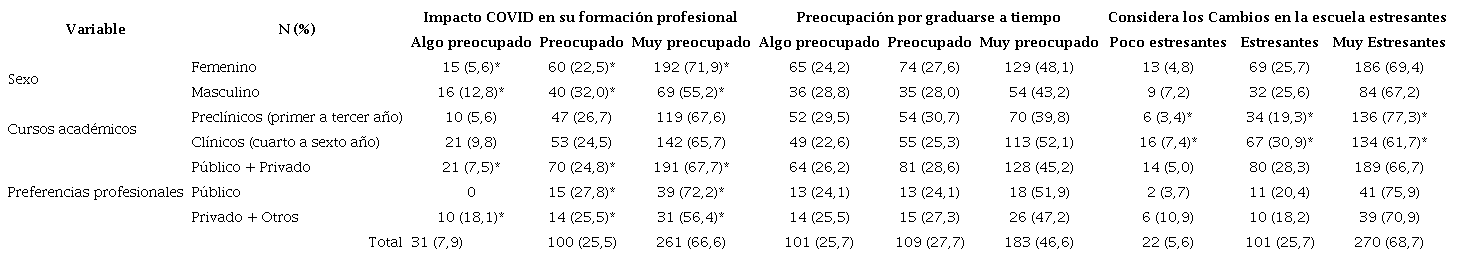 Impacto de la pandemia en las preocupaciones sobre la formación profesional de los estudiantes de odontología: Los estudiantes manifiestan sentir una gran preocupación en torno al impacto de la COVID-19 en su proceso formativo profesional (66,6%; N=261), Tabla 3. Sin embargo, son las estudiantes del sexo femenino (71,9%; N=192; p<0,05) quienes declaran sentirse más preocupadas respecto a los hombres. Los estudiantes, independiente de la preferencia laboral una vez titulados, creen que la pandemia repercutirá en sus procesos educativos e indican sentirse muy preocupados por graduarse a tiempo (46,6%; N=183). Los cursos preclínicos y clínicos expresan sentir que las modificaciones realizadas para afrontar la pandemia han sido muy estresantes, siendo mayor en los estudiantes de los cursos preclínicos (77,3%; N=136; p<0,05).
