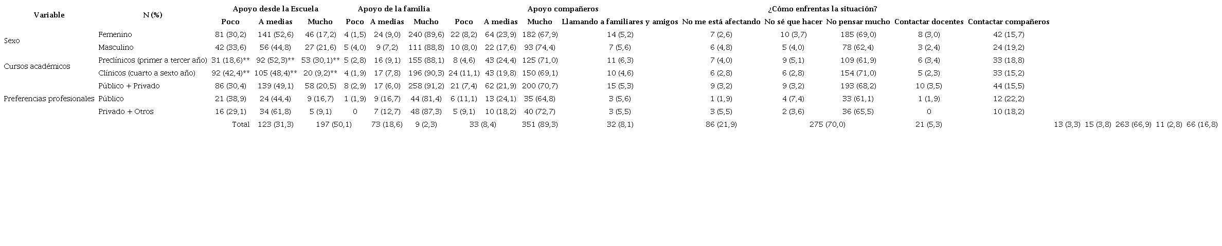 Estrategias de afrontamiento de los estudiantes de odontología durante la pandemia: Se indagó en la percepción de apoyo del estudiantado en tres ámbitos: apoyo de la escuela, familiar y de sus compañeros, Tabla 4. Los resultados arrojaron diferencias estadísticamente significativas referentes a cómo la escuela de odontología los había ayudado a sobrellevar de mejor manera el escenario pandémico. Los cursos preclínicos advierten que el apoyo brindado ha sido moderado, representado por un 52,3% (N=92) del grupo señalado. Sin embargo, un 18,6% (N=31) de estudiantes preclínicos manifiestan poco apoyo brindado (p<0,001). Esto se exacerba aún más en los cursos clínicos en donde un 42,4% (N=92) de ellos considera que la escuela les ha dado escaso apoyo para enfrentar la situación de pandemia. Esta información se condice con el bajo número de estudiantes de cursos superiores que declaran haber recibido mucho apoyo, representado tan solo por el 9,2% (N=20) (p<0,001). Respecto al apoyo familiar y de pares, no se evidenciaron diferencias estadísticamente significativas. La estrategia de afrontamiento más utilizada fue “tratar de no pensar mucho” (66,9%; N=263), seguida de la “comunicación con compañeros” (16,8%; N=66).