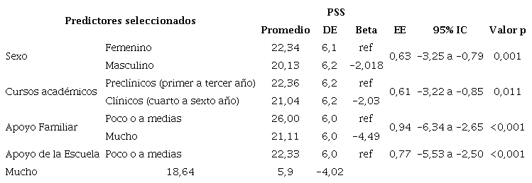 Niveles de estrés percibido (PSS) entre los estudiantes de odontología: Se realizó una regresión lineal para determinar predictores relacionados a PSS. La media de PSS fue de 21,64 puntos, es decir moderado. Los resultados muestran que el sexo femenino, pertenece a cursos preclínicos, escaso apoyo familiar y de la escuela, son variables que aumentan el PSS. El modelo predice que aquellos estudiantes de sexo masculino (Beta=-2.018), que cursan módulos clínicos (Beta=-2.03), que reportan mucho apoyo familiar (Beta=-4.02) y de la escuela (Beta=-4.02), perciben menos estrés. Siendo este modelo estadísticamente significativo F (4,386) = 17,87 (p<0.001) y explica un 16% de la variación en los PSS de los estudiantes, Tabla 5.