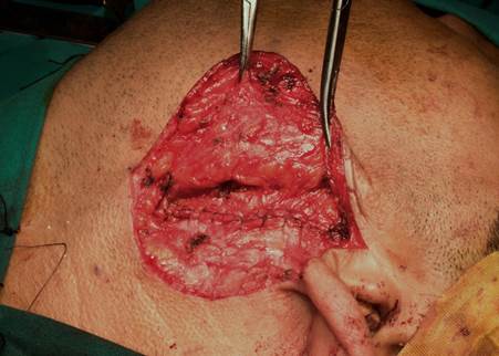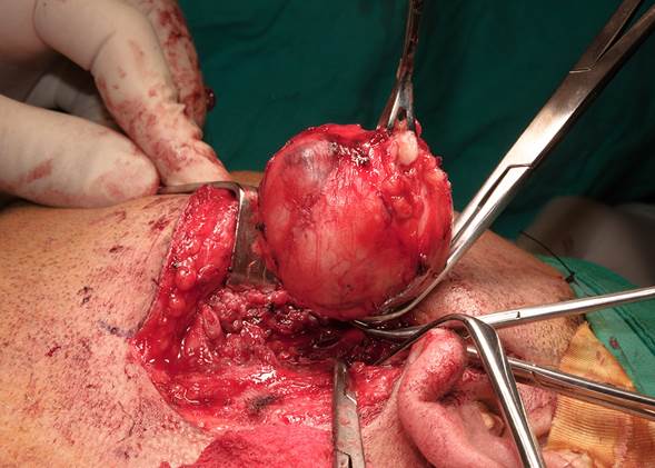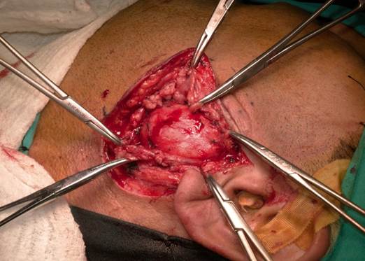 All procedures are under general anaesthesia with orotracheal intubation. The first option for antibiotic prophylaxis is intravenous cefazolin (1 g) or clindamycin (600 mg) in the case of penicillin allergy. In all procedures participated the surgeon with the most experiences and one of the three maxillofacial specialists from the team as an assistant surgeon. The approach used in all cases was the modified Blair incision, which consists of an incision through preauricular area extends to the mastoid process and posterior border of ramus, or the submandibular region in major lesions7. Posteriorly, the dissection through ECD is without the use of an intraoperative nerve-monitoring system. After ensuring hemostasis using a Valsalva manoeuvre, the parotid capsule is closed, followed by plane closure with polyglycolic acid 4-0. For the surface plane, Nylon 5-0 is the first option in a transdermal technique (figures 1-4).