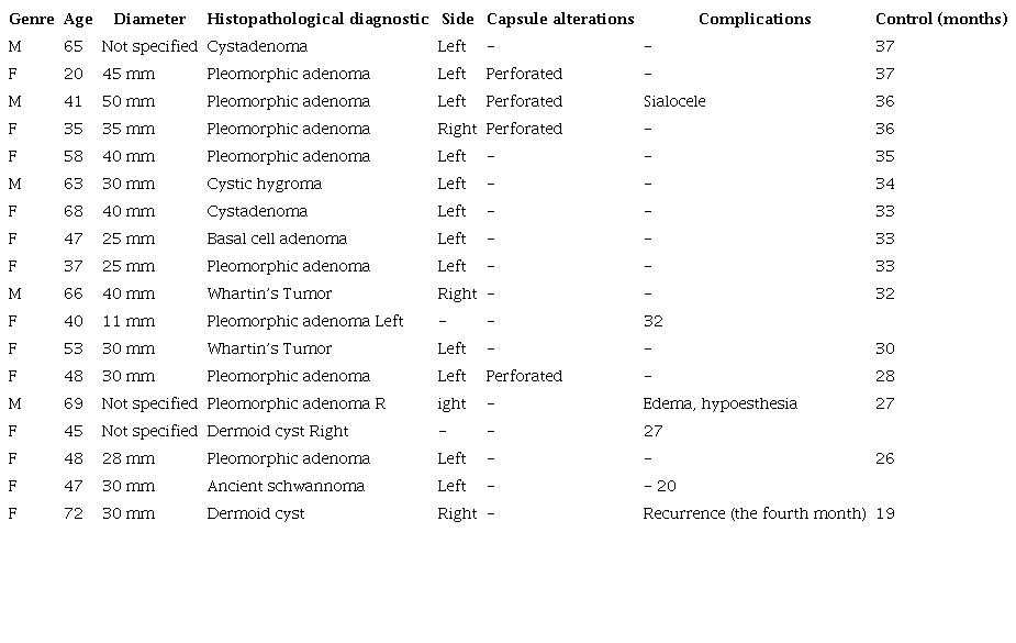 A total of 18 patients (13 women and 5 men) treated between 2018 and 2020 met the inclusion criteria. The age range was 20-72 years. The dimensions of the lesions were within the range of 11 to 50 mm. The primary lesion was PA (n: 9). The side most frequently affected was left in 12 cases. The capsules were kept unscathed in 14 cases. Complications were observed in three patients and included oedema, a sialocele, and hypoesthesia of the area accompanied by recurrence (Table 1).