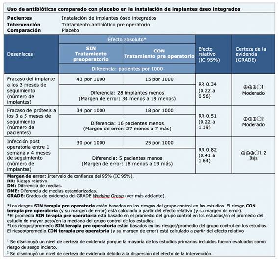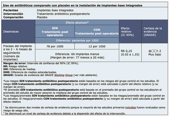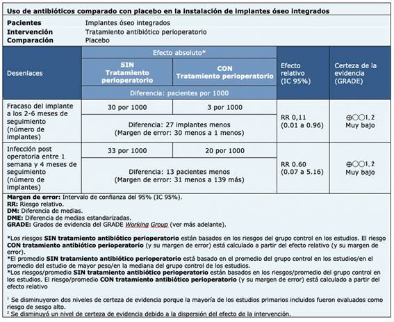 ● No es posible establecer con claridad si el tratamiento de terapia antibiótica (perioperatoria y post operatoria) en comparación a placebo reduce el fracaso de los implantes a los 2-6 meses de seguimiento y de infección postoperatoria a las 1, 2, 4 semanas y a los 2, 3 y 4 meses de seguimiento, debido a que la certeza de la evidencia existente ha sido evaluada como muy baja.