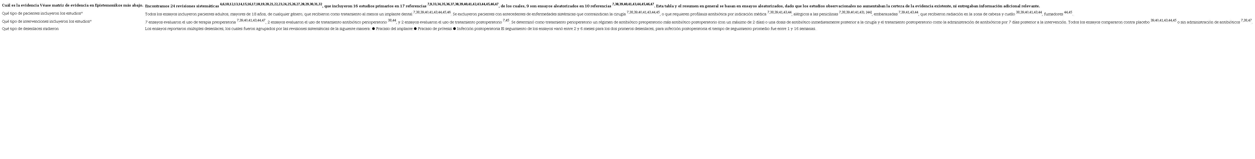 ● Por otro lado, no está claro si el tratamiento de terapia antibiótica (perioperatoria y postoperatoria) en comparación a placebo reduce el fracaso de los implantes y de infección postoperatoria, debido a que la certeza de la evidencia existente es muy baja.
