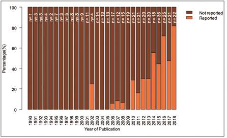 The fact that roughly three-quarters of the RCTs published in the journals selected for our study did not disclose conflicts of interest statements or funding sources is disappointing. Our findings are consistent with another study that evaluated conflicts of interest statements and funding sources for 10 top general surgical journals21. This study found that little over half of the included RCTs did not reveal the funding source, and 75 per cent of the included RCTs did not report any COI statement. A cross-sectional study published in 2003 found that 89% of RCTs published in five general medical journals disclosed a source of funding22 and another study of 289 cancer trials published between 2005 and 2006 found that 75% of the RCTs reported a source of funding and 69% report competing interests23. In contrast, our study, which extends from 1990 to 2018, found a 26% disclosure of funding source, revealing poor compliance on this item compared to other studies.