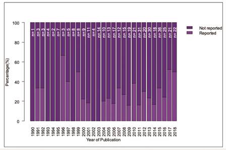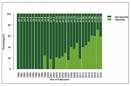 Of the total RCTs included (n = 392), only 102 (26%) reported a conflict-of-interest statement, of which only three declared the existence of a COI and 99 declared no competing interests. The remaining 290 (74%) did not describe anything in the reviewed text regarding competing interests. The conflicts of interest statement only began to be reported in 2002 in this population of articles and improved slightly from 2010 onwards (Figure 1).