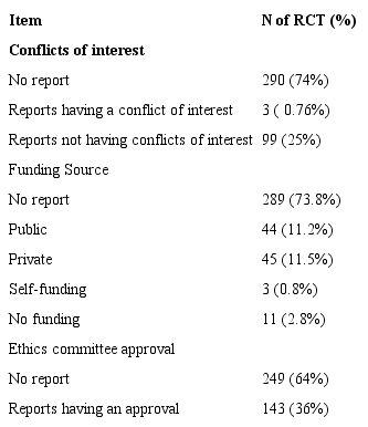 Background: Confidence in the results reported by randomized clinical trials (RCTs) depends mainly on the internal validity of the trial and its conduct, but also on other aspects related to health research such as the complete reporting of conflicts of interest (COI), funding sources and approval by ethics committees. Bias in the study results may arise from any one of these elements. Prior studies have explored the reporting of these items in the medical literature, but there are no reports on RCTs published in Spanish and Latin American journals. This study aimed to evaluate the reporting of COIs, funding sources, and approval by ethics committees of RCTs published in Spanish and Latin American journals in dentistry, geriatrics and neurology.