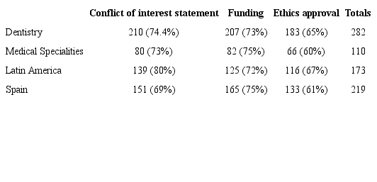 Conclusions: RCTs published in the Spanish language in dentistry, neurology, and geriatrics had poor compliance with the reporting of a COI, source of funding, and ethics committee approval. Future research should evaluate the accuracy and completeness of COI statements and their relationship to the funding source and direction of the results.