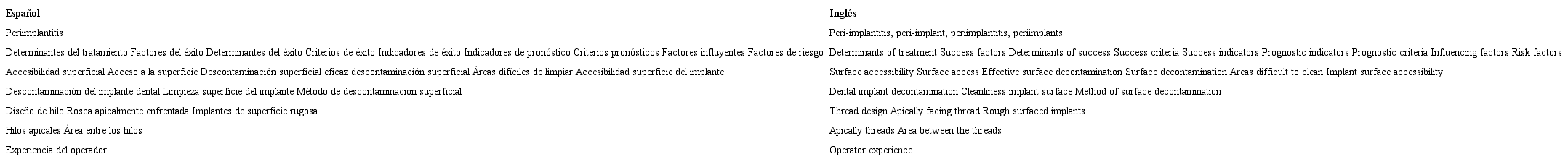 Se realizó una búsqueda electrónica en MEDLINE, Scielo y Springerlik de publicaciones entre el los años 2013 y 2021. Se realizó una búsqueda sensible combinando los términos MeSH de “Periimplantitis” combinándolo mediante operadores booleanos como AND con “Prognosis” lo que permitió identificar a los factores relevantes asociados a tratamiento de periimplantitis que se han descrito en la literatura que se han asociado a la efectividad de su tratamiento. Posterior a ello, se realizaron diferentes estrategias combinando “Periimplantitis (MeSH)” asociado con los diferentes factores pronósticos en texto libre (Tabla 1) Artículos con idioma distinto al ingles y español, fueron excluidos.