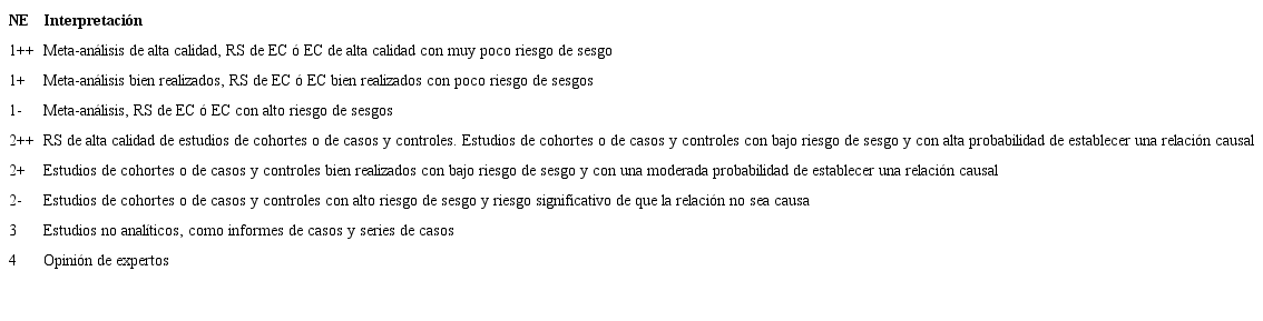 Fue realizado basado en la mejor evidencia disponible obtenida de esta revisión sistemática de la literatura utilizando la clasificación de niveles de evidencia de SIGN (Scottish Intercollegiate Guidelines Network)8, este evalúa en base a aspectos metodológicos y de diseño de los estudios. Permite clasificar los estudios según su nivel de evidencia científica, que va desde el 1++, donde se incluyen los meta análisis, revisiones sistemáticas y ensayos clínicos de alta calidad y bajo sesgo; hasta el nivel 4, que incluye las opiniones de expertos (Tabla 2). Basándose en la tradicional pirámide de evidencia en donde los estudios de laboratorio se ubican en la base de la pirámide, en esta evaluación se clasificarán como nivel 4, esto es por que son estudios de pruebas en modelos animales o estudios in vitro cuyos resultados no necesariamente se aplican en las personas y que deben ser probados en diseños epidemiológicos que permitan confirmar estos hallazgos. Al menos dos autores analizaron independiente la evidencia encontrada y le asignaron un nivel de evidencia. Los desacuerdos fueron resueltos por consenso. Si no se logra acuerdo, se invita a un tercer revisor para resolver.