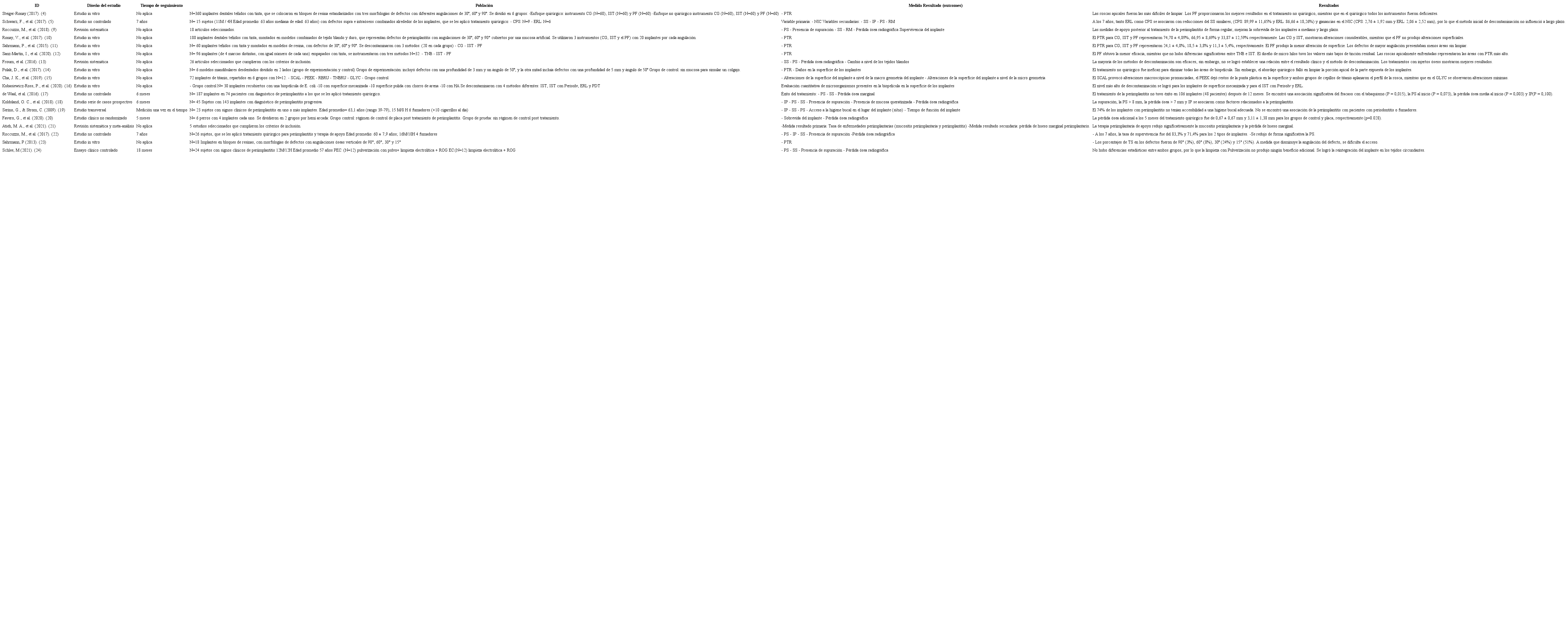 Se incluyeron 5 estudios experimentales: 1 ensayo clínico controlado sobre la efectividad de la limpieza electrolítica, 3 estudios no controlados, para evaluar la efectividad de los tratamientos quirúrgicos, y 1 ensayo clínico no randomizado sobre la terapia de mantención post tratamiento, la mayoría de los estudios clínicos encontrados, carecía de grupo de control. También los estudios suelen considerar como medida resultado la sobrevivencia, pero no el éxito de los implantes. Sin embargo, la mayoría de los estudios presentó cegamiento y calibración de los operadores, con el fin de disminuir los sesgos. En relación a los estudios observacionales, se incluyó 1 estudio transversal y 1 serie de casos, que describieron los factores asociados a la periimplantitis.