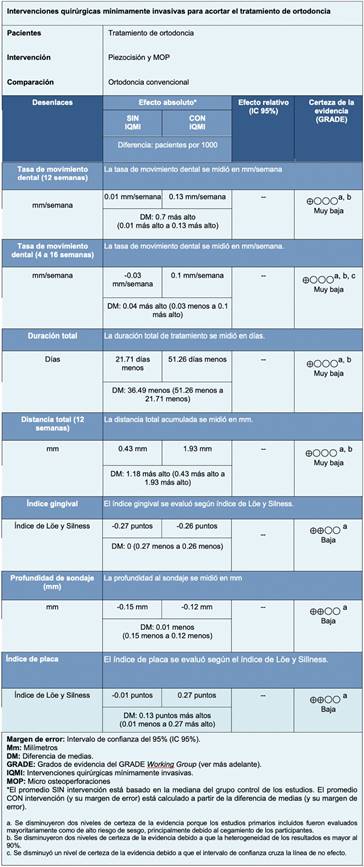 Resultados y conclusiones: Identificamos 39 revisiones sistemáticas que en conjunto incluyeron 43 estudios primarios, de los cuales, 31 corresponden a ensayos aleatorizados. Concluimos que las intervenciones quirúrgicas mínimamente invasivas podrían aumentar la tasa de movimiento dental a las 12 semanas, la distancia total acumulada, la tasa de movimiento dental y reducir la duración total de tratamiento, pero la certeza de la evidencia es incierta. Además, podrían resultar en poca o ninguna diferencia sobre el índice gingival, la profundidad de sondaje y el índice de placa.