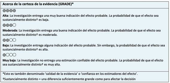 Realizamos una búsqueda en Epistemonikos, la mayor base de datos de revisiones sistemáticas en salud, la cual es mantenida mediante búsquedas en múltiples fuentes de información, incluyendo MEDLINE, EMBASE, Cochrane, entre otras. Extrajimos los datos desde las revisiones identificadas y analizamos los datos de los estudios primarios. Con esta información, generamos un resumen estructurado denominado FRISBEE (Friendly Summaries of Body of Evidence using Epistemonikos), siguiendo un formato preestablecido, que incluye mensajes clave, un resumen del conjunto de evidencia (presentado como matriz de evidencia en Epistemonikos), metanálisis del total de los estudios cuando sea posible, una tabla de resumen de resultados con el método GRADE y una sección de otras consideraciones para la toma de decisión.