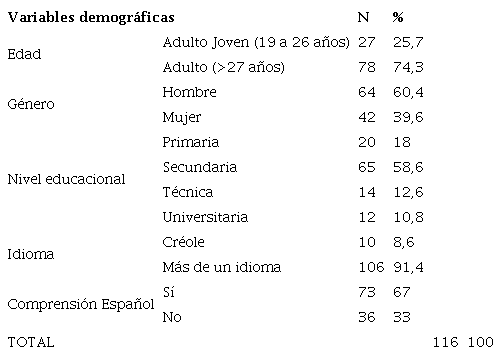 Participaron 116 personas en la encuesta adaptada, la mayoría de los participantes fueron hombres (n=64; 60,4%) que pertenecían al rango de edad desde los 19 a 30 años (n=78; 74,3%). El nivel educacional de la mayoría alcanza la educación secundaria (n=65; 58,6%) y alrededor de un tercio de los encuestados no comprende el idioma español (n=36; 33,0%) (Tabla 1).
