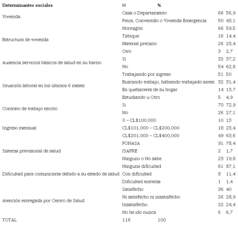 En relación a los determinantes sociales, el mayor porcentaje de los sujetos pertenece a FONASA (n=91; 78,4%), un porcentaje considerable de participantes vive en una pieza, conventillo o vivienda de emergencia (n=50; 43,1%) y casi dos tercios no cuenta con servicios básicos de salud en su barrio (n=64; 62,8%). Casi un tercio de los encuestados no tiene contrato de trabajo (n=26; 27,1%) y el ingreso de más de un tercio de ellos es menor a $200.000 (n=28; 36,4%), considerando que el ingreso máximo dentro de los participantes es de $400.000 (Tabla 2).