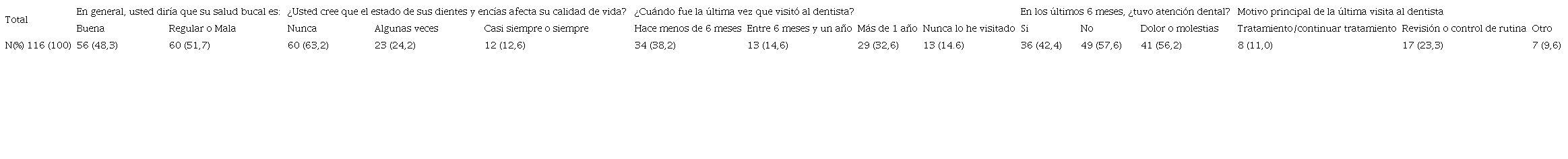En relación a salud bucal, casi la mitad de los encuestados considera que ésta es regular o mala (n=60; 51,7%) y más de un tercio reporta que esta condición afecta su calidad de vida algunas veces (n=23; 24,2%) o casi siempre o siempre (n=12; 12.6%). Alrededor de un tercio de los participantes no ha acudido al dentista en más de un año (n=29; 32,6%) y un 14,6% nunca lo ha visitado. El dolor fue el motivo principal de su visita al dentista de más de la mitad de los entrevistados (n=41: 56,2%) (Tabla 3).