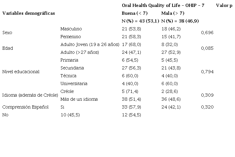 Conclusión: Los migrantes haitianos, en su mayoría, perciben su salud oral como regular o mala. Sobre todo, en grupos más desprotegidos la salud oral es percibida como deteriorada y parece tener un efecto negativo en su calidad de vida.