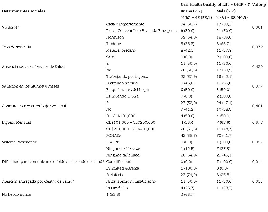 En cuanto a determinantes sociales, un 66,7% (n=34) de los participantes que viven en casa o departamento tiene un OHIP mayor a 7, a diferencia de los que viven en pieza, conventillo o vivienda de emergencia, donde solo un 30% (n=9) tiene un OHIP mayor a 7. De los encuestados que tiene previsión de salud pública, del Fondo Nacional de Salud (FONASA) -la mayoría de los participantes-, un 58,3% (n=42) presenta un OHIP mayor a 7. Dentro de los encuestados que se encuentran satisfechos con la atención entregada en su centro de salud, un 74,2% (n=23) tiene un OHIP mayor a 7 y de los que se encuentran insatisfechos, este porcentaje sólo alcanza un 26,7% (n=4) (Tabla 5).