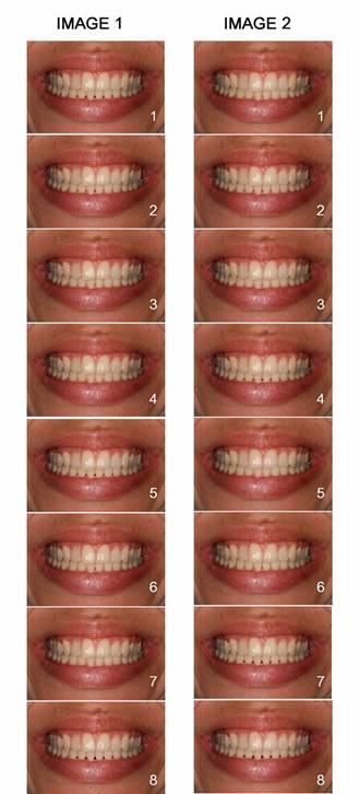 The method consisted of using a photograph of a patient’s smile with normal occlusion and presence of all teeth, simulating different sizes of black spaces between the anterior teeth through modification by a computer program. Eight photographs were obtained with sizes of black spaces varying from 0 to 3.5 mm and 0.5 mm interval for each image.