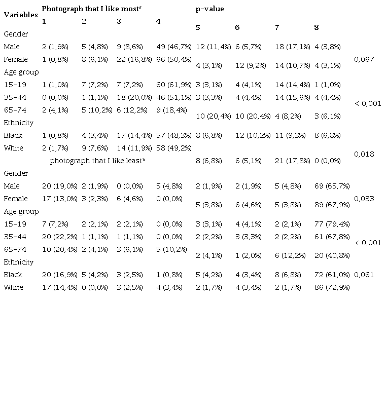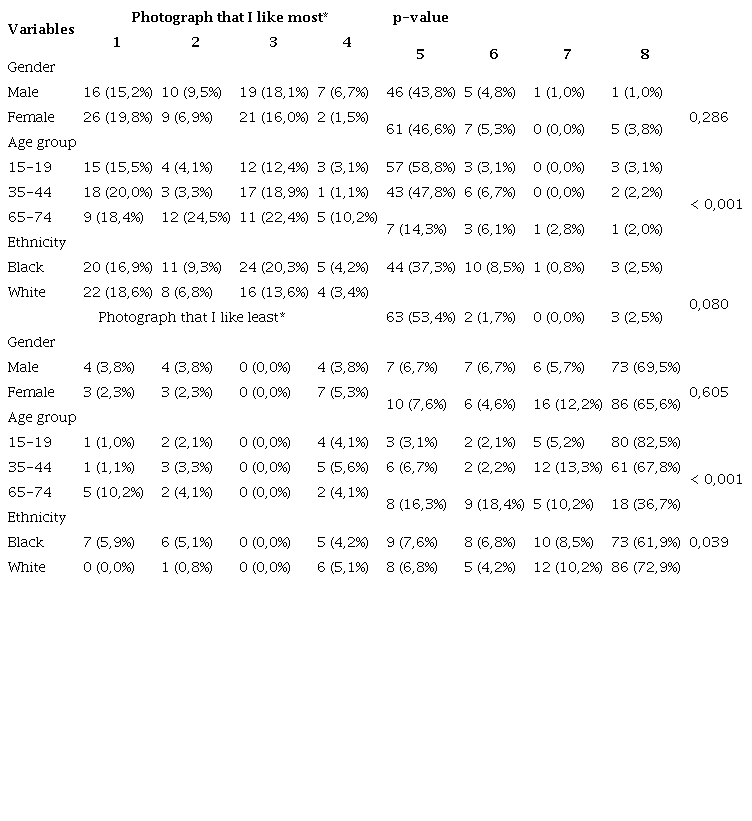 Table 2 shows the perception of the evaluators of the research regarding preferences in relation to the photographs displayed in image 2 (which contained the photographs randomly rearranged, shown in Figure 2), according to gender, age group and race. Significant differences were observed in the proportions: between age groups, both for the answer on the best photograph as about the worst photograph, and between races, on the answer about the worst photograph. Data indicate that: the frequency of evaluators that liked more of photograph 5 (which had no black spaces) and less photograph 8 (which had larger black spaces) was higher in the 15-19 age group and decreased progressively in older age groups (35-44 and 65 74). The frequency of evaluators that liked more photograph 8 was higher among Caucasian evaluators than among Negroid ones.