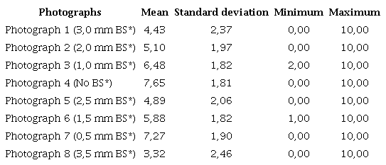 In Table 1, the perception of the research evaluators on preferences in relation to the photographs displayed in image 1 (containing the randomly organized photographs, shown in Figure 2) is presented, according to gender, age group and race. Significant differences were observed about the proportions: between genders for the answer on the worse photograph; between age groups, both for the answer of which was the best photograph as to the answer about which was the worst; and between ethnicities, for the answer about the best photograph. Data indicate that the frequency of evaluators who liked photograph 1 less (which featured black spaces of 3.0 mm) was higher among men than among women, the frequency of evaluators that liked more photograph 4 (which had no black spaces) and less photograph 8 (which had larger black spaces) was higher in the age group of 15-19 and decreased progressively in the older age groups (35-44 and 65 74). The frequency of evaluators who liked photography 7 more (which featured black spaces of 0.5 mm) was greater among Caucasian evaluators than among Negroid ones.