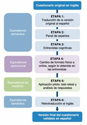 El proceso de validación transcultural fue realizado en 6 etapas: 1) Traducción inglés-español, 2) Panel de expertos, 3) Entrevistas cognitivas, 4) Adecuación del formato de aplicación, 5) Estudio piloto y 6) Retrotraducción al inglés. Las etapas y dominios correspondientes están representados en la Figura 1. Considerando las propiedades psicométricas del instrumento, la factibilidad fue evaluada según las percepciones obtenidas en las entrevistas cognitivas y la tasa de respuesta del estudio piloto. La confiabilidad se midió durante el estudio piloto, obteniendo consistencia interna y estabilidad. Se evaluó validez aparente en las entrevistas cognitivas y validez de contenido con el panel de expertos. Cada etapa se describe a continuación: