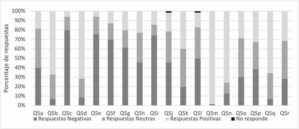 Las respuestas obtenidas en la aplicación piloto se analizaron descriptivamente en frecuencias porcentuales. Además, con el objetivo de describir la tendencia de las respuestas, y al igual como se realizó en el artículo original7, se analizó la P5 con opción de respuesta Likert “Durante una semana laboral típica, ¿con qué frecuencia implementa los siguientes procesos?”, que consultaba sobre las técnicas de comunicación descritas en la Tabla 1, las respuestas se subcategorizaron en respuestas positivas (Siempre y La mayor parte del tiempo), neutras (De vez en cuando) y negativas (Nunca o Casi nunca) y se describió su porcentaje. El análisis de los datos se realizó a través del programa estadístico R-Project22.