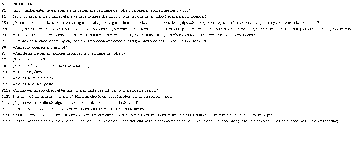 Con este propósito, se elaboró una pauta considerando el sistema de evaluación de preguntas propuesto por Willis y Lesser21 conocido como Question Appraisal System (QAS). Se entrevistó a 12 odontólogos elegidos por conveniencia y con los mismos criterios de inclusión, los cuales no participaron de la aplicación piloto posterior. Las entrevistas fueron realizadas por cinco investigadoras en el lugar de trabajo de los profesionales. Luego fueron transcritas y analizadas cualitativamente por 2 miembros del equipo, identificando hallazgos hasta la saturación de datos. Las dudas de interpretación se consultaron a una de las autoras del cuestionario original.