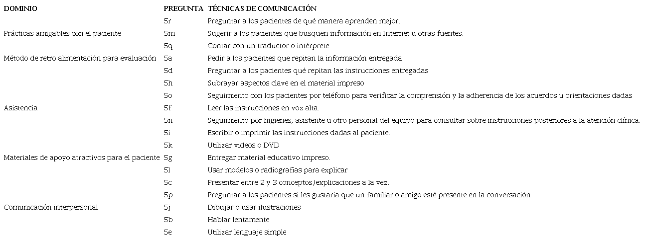 El cuestionario consta de 15 preguntas, con distintos formatos de respuestas a) escala Likert de cinco puntos, (b) opción múltiple, (c) respuestas dicotómicas, (d) respuesta única, (e) respuesta múltiple y (f) respuesta abierta (Tabla 1). En la pregunta 5 se indaga sobre el uso de 18 técnicas de comunicación entre odontólogo-paciente en la atención clínica, agrupadas en cinco dominios (Tabla 2). Además, consulta sobre aspectos laborales, interés y posibles oportunidades de capacitación en comunicación. El cuestionario permite monitorear las fortalezas y dificultades en las habilidades comunicativas de los odontólogos7.