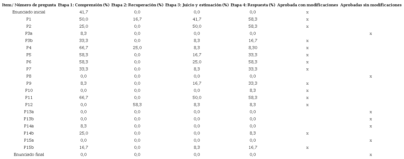 En la etapa Recuperación en la memoria, el 58,3% tuvo problemas con la P12 sobre código postal y 25,0% con la P4. En cuanto a la etapa de Juicio y estimación, los problemas se concentraron en la P1, P2 y P5, todas con 50% de los entrevistados con alguna dificultad. Otros problemas fueron menores a 9%. En la etapa de Respuesta o reporte, la proporción de participantes con problemas llegó a 33%, ocurriendo en la P1, P2, P6, P10 y P11.
