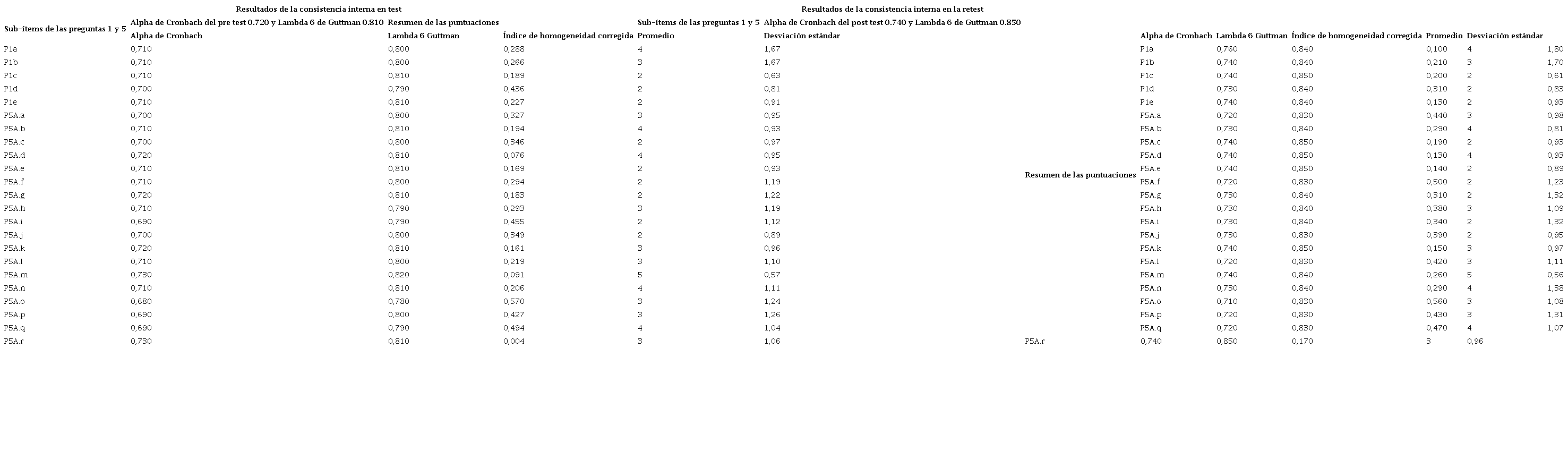 Se realizó un análisis de casos completos, descartando aquellos participantes que enviaron cuestionarios incompletos. Para la confiabilidad del cuestionario se analizó la consistencia interna mediante los coeficientes de α-Cronbach y λ-Guttman en ambas aplicaciones del cuestionario, donde un valor mayor a 0.7 se consideró como indicador de alta consistencia interna22. La estabilidad se obtuvo con la técnica de test-retest, donde se midió el coeficiente de correlación ρ−Spearman, el Coeficiente de Correlación Intraclase (CCI) y el Coeficiente de Correlación de Concordancia (CCC). Además, se calculó el Índice de Homogeneidad Corregido (IHC), eliminado aquellos ítems con valores menores a 0,222.