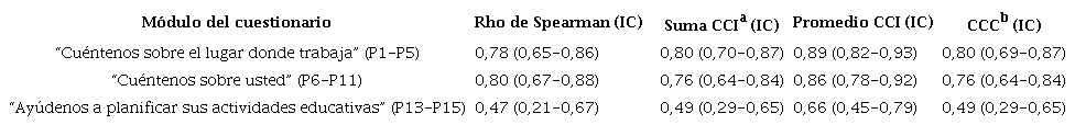 La Tabla 5 muestra los resultados del análisis de los coeficientes por cada módulo del cuestionario. Los módulos “Cuénteme sobre su trabajo” y “Cuénteme sobre usted” presentaron alta estabilidad, con coeficientes mayores a 75%. Sin embargo, la estabilidad fue menor en el módulo “Apoyo en la elaboración de actividades educativas”, obteniendo solo el CCI significativo (valor-p<0,05).