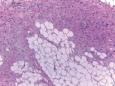 Macroscopy showed a yellowish or tan-white color and a rubbery, firm, or gritty consistency5. Histopathology contains abundant adipose tissue that usually accounts for >50% of the tumor, and the fat cells generally mature and lack atypia. A fibroblastic spindle element characteristically forms fascicles concentrated in septal regions and along the perimysial surface of skeletal muscle. The fibroblastic part has only mild atypia and a low mitotic rate7. This description was consistent with the appearance of the resected mass.