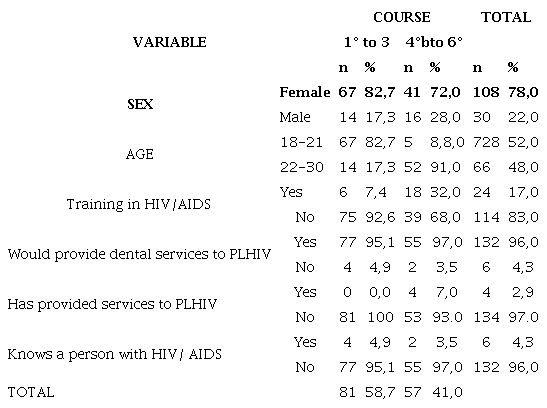 One hundred forty-five dental students answered the invitation, but seven have not answered the whole instrument. The final sample comprised 138 dental students, whereas most of them reported not having training in HIV/AIDS nor providing dental services to PLHIV (Table 1).