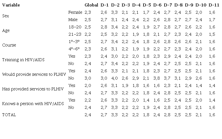 Dimension 2 had the highest values, specifically, the item 8 “Una persona con VIH/SIDA debe estar obligada a revelar siempre su condición a los/as profesionales de salud, para que éstos/as tomen las debidas precauciones” (“A person with HIV/AIDS must always disclose their condition to health professionals, so that they can take due precautions”) had a mean of 4.1. Which had a median of 4.7 in 2º students and in students that would not provide dental services to PLHIV.