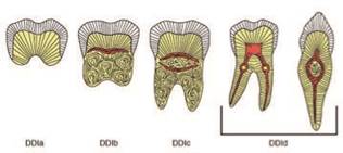 · DD-Ib: cámara pulpar pequeña con disposición horizontal y aspecto creciente única, con raíces formadas de milímetros de longitud y frecuentemente acompañado de focos radiolúcidos periapicales.