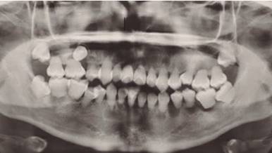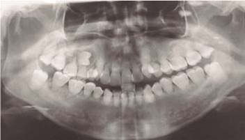 Se solicita una radiografía panorámica (Figura 2) la cual muestra una dentición definitiva completa; con un escaso desarrollo radicular y ausencia de cámara pulpar en la totalidad de sus piezas dentarias. Se observa también presencia de focos periapicales compatibles con lesiones periapicales de carácter inflamatorio asociados a múltiples piezas dentarias.