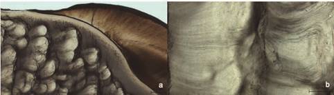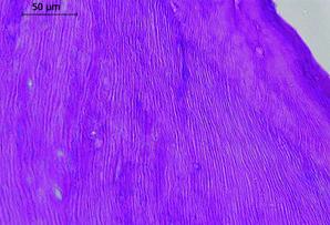 En lo que respecta a la histopatología, se puede una estructura conservada tanto en el esmalte como en la dentina del manto; la cual es la primera dentina en formarse y que posee un espesor aproximadamente de 20 μm7. Por otro lado, la dentina subyacente adopta una apariencia irregular en forma de glóbulos dentinarios, adquiriendo la apariencia descrita como “corrientes de aguas que circulan entre piedras”7.
