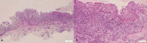 Por la presencia de fístula activa se optó por la exodoncia del premolar incluido junto con la exéresis de la lesión asociada, los cuales fueron sometidos a un estudio histopatológico. En la lesión asociada (Figura 6) se pudo encontrar un abundante infiltrado inflamatorio compuesto mayoritariamente por linfocitos y plasmocitos; estableciendo el diagnóstico de granuloma periapical.