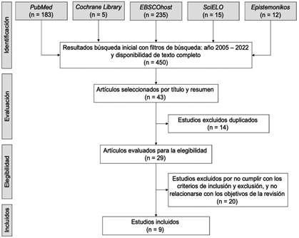 Material y método: se realizó una búsqueda de la evidencia disponible de manera electrónica en las bases de datos PubMed, Cochrane Library, EBSCOhost, SciELO y Epistemonikos, con filtro de búsqueda de artículos publicados entre los años 2005 y 2022, y con disponibilidad de texto completo.