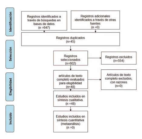 Se obtuvo un total de 647 artículos de acuerdo con la búsqueda. Finalmente 48 artículos fueron incluidos en la revisión. El tipo de estudio se distribuyó en 2 grandes grupos, 38 artículos fueron estudios descriptivos transversales y 10 estudios longitudinales prospectivos. En la Figura 1 se resume el proceso de búsqueda, selección e inclusión de los artículos incluidos en la revisión sistemática.