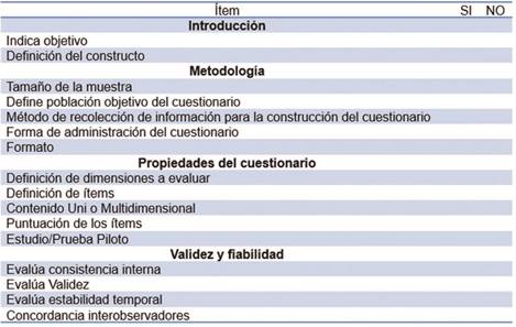 Al aplicar la lista de verificación de calidad se pudo observar que el 75% de los artículos evaluó más de un 80% del total de ítems y el 25% restante evaluó entre el 60 y 80% de los ítems. Solo el 21% de los artículos evaluó la concordancia inter observadores, siendo el ítem más bajo seguido por “Definir la puntación de los ítems” con un 42% y “Evaluar la estabilidad temporal” con un 58% de los artículos.