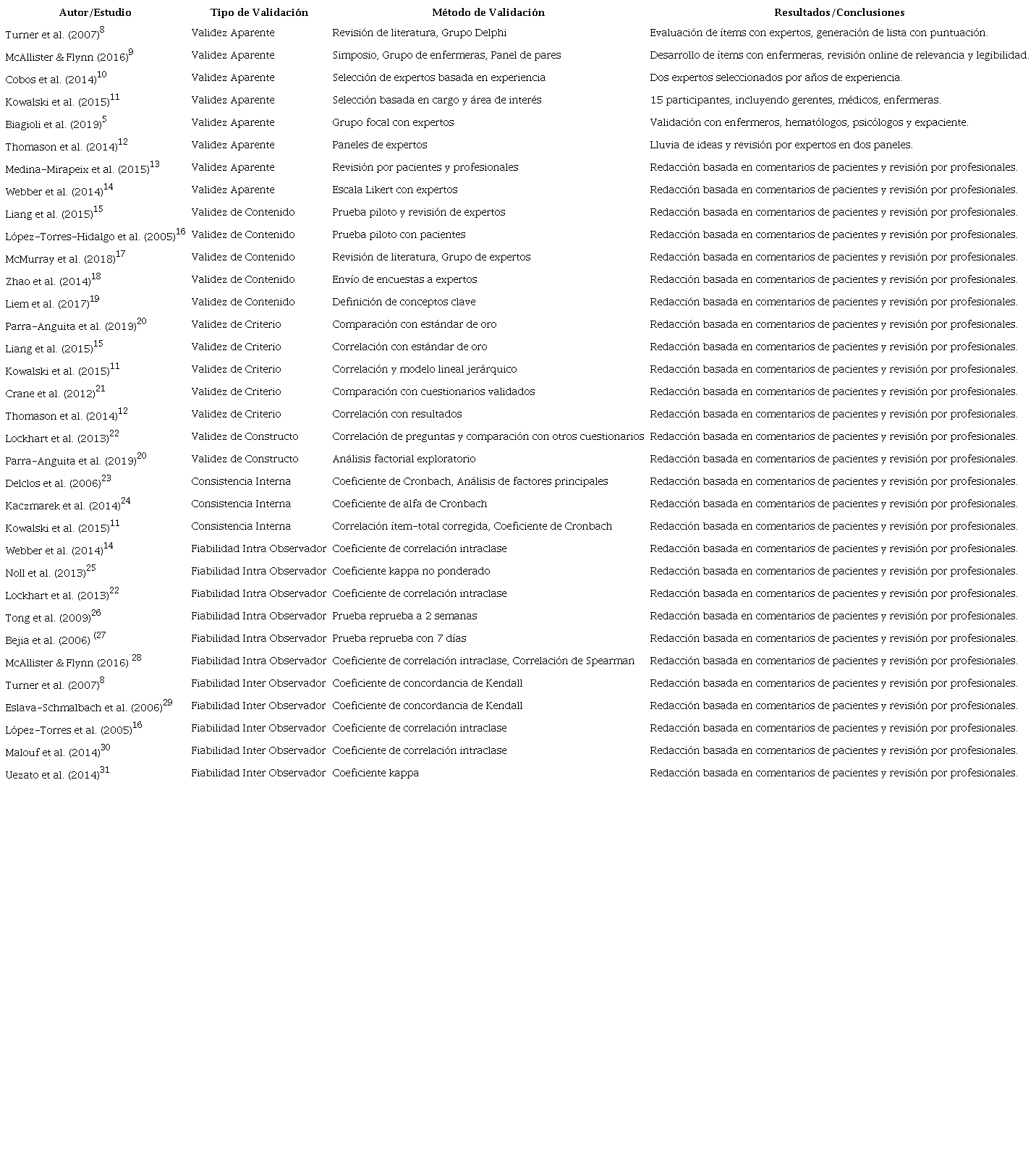 La validez se refiere a si el instrumento mide lo que se propone medir. Se pueden evaluar tres tipos de validez: la validez de contenido, la validez de criterio y la validez de constructo. La validez de contenido se basa en la definición precisa del dominio que se va a evaluar y en el juicio de expertos. La validez de criterio implica relacionar las puntuaciones del instrumento con otras variables externas al mismo7. La validez de constructo se relaciona con si el instrumento refleja la teoría subyacente del constructo que se está midiendo.